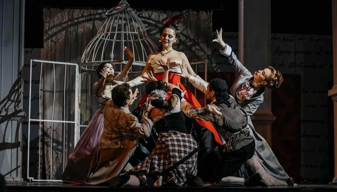 Утонченные итальянские арии, исполняемые в жанре мюзикла, квинтет музыкантов, вовлеченных в опасные связи, изысканные и откровенные костюмы, стильные декорации, одним из элементов которых станет большая клетка – капкан для одних героев и тайный будуар для других, борьба на шпагах и страстные танцы.