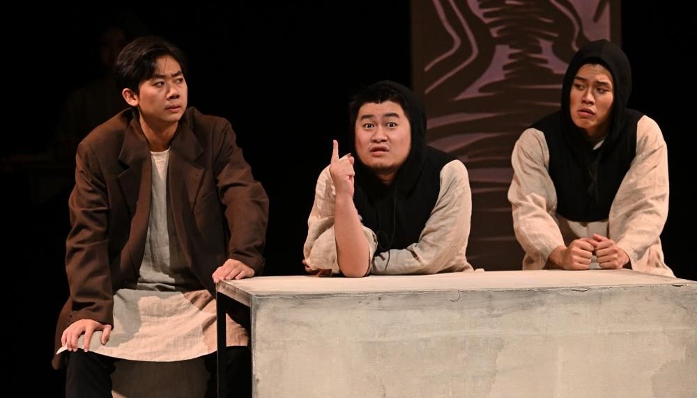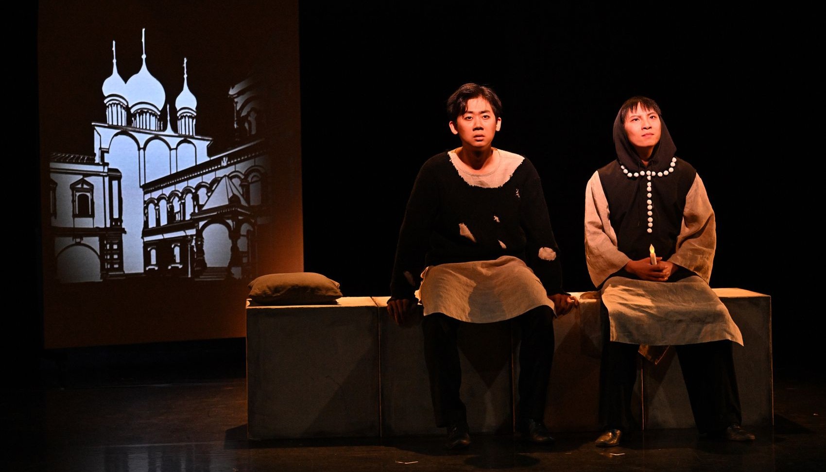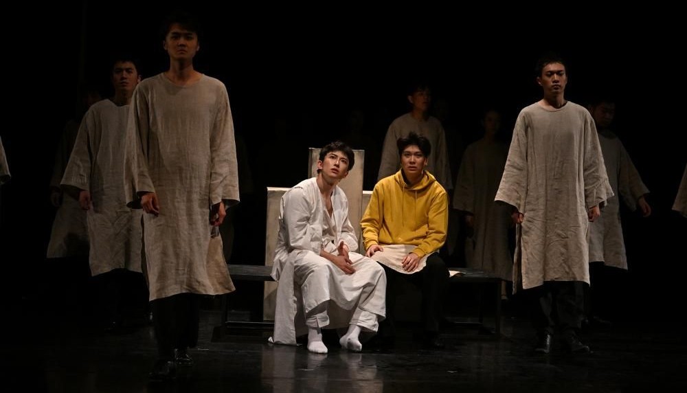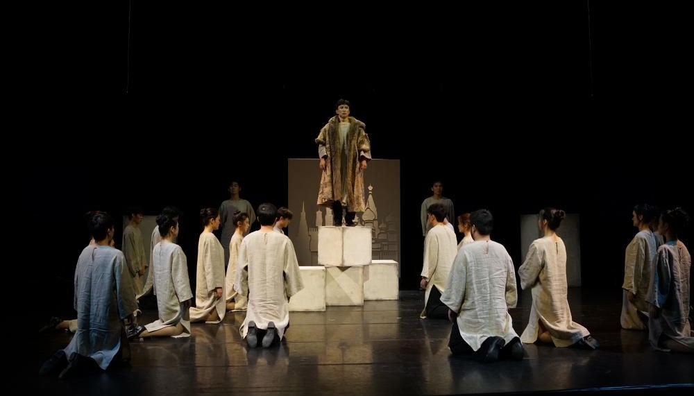 В центре спектакля – актеры, скоморохи, разыгрывающие на глазах зрителей те или иные повороты пушкинского сюжета. Магическое «если бы» становится главным законом представления. Русскую трагедию играют китайские актеры – студенты 4 курса. Это позволяет периодически использовать китайские художественные приемы, ибо вопросы, на которые пытается ответить Пушкин, – общечеловеческие, общемировые, не связанны именно с Россией XVII века. К тому же, следуя традиции Шекспира, Пушкин в трагедии показывает много комических моментов, которые оттеняют и проявляют главный конфликт: человек и Бог, человек и Судьба.